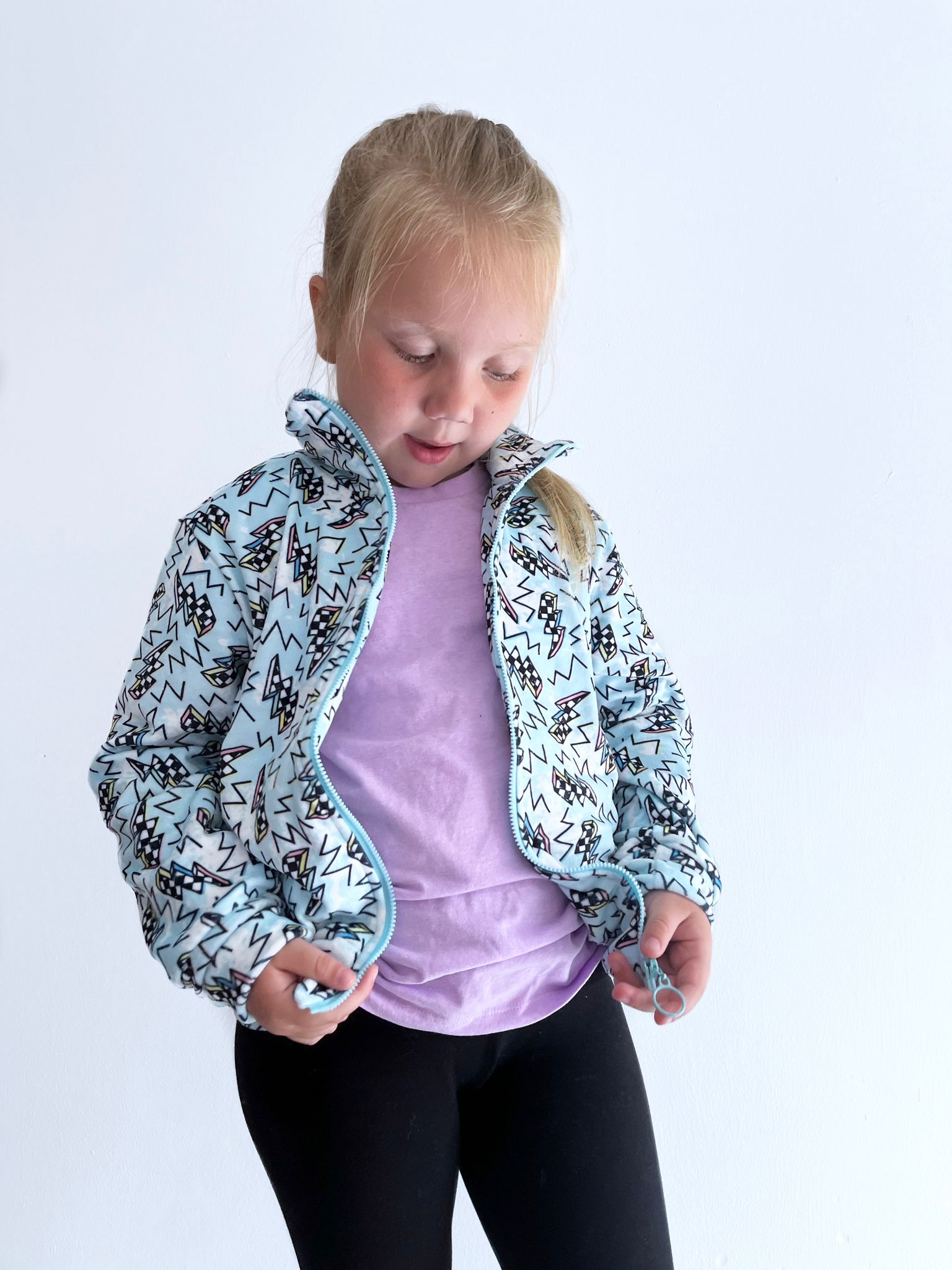 lightning bolt kids jacket, 90s fleece for kids, retro lightning print hoodie, pastel fleece zip-up, unisex kids outerwear, checkerboard print jacket, blue cartoon jacket, cozy toddler fleece, kids graphic jacket, bold fleece hoodie