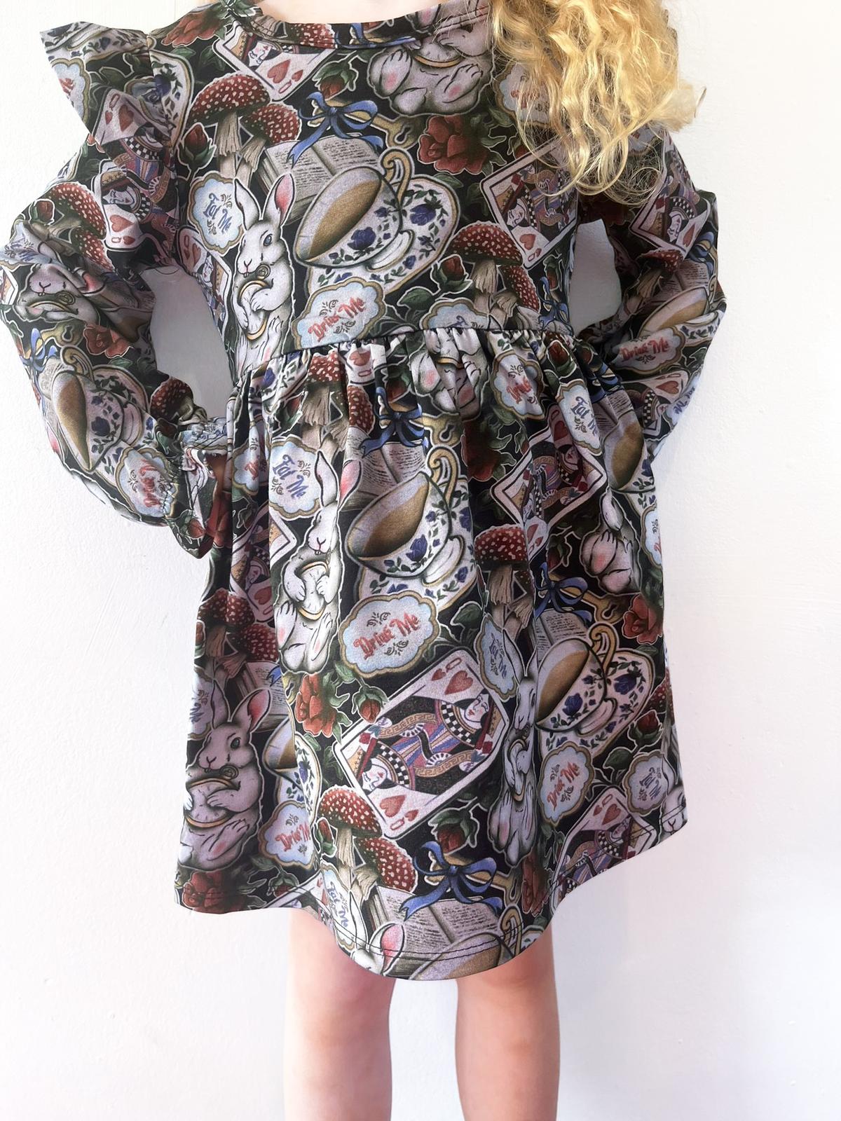 🐇 “Wonderland Whimsy Ruffle Dress” – Tea, Toadstools & Curious Adventures
